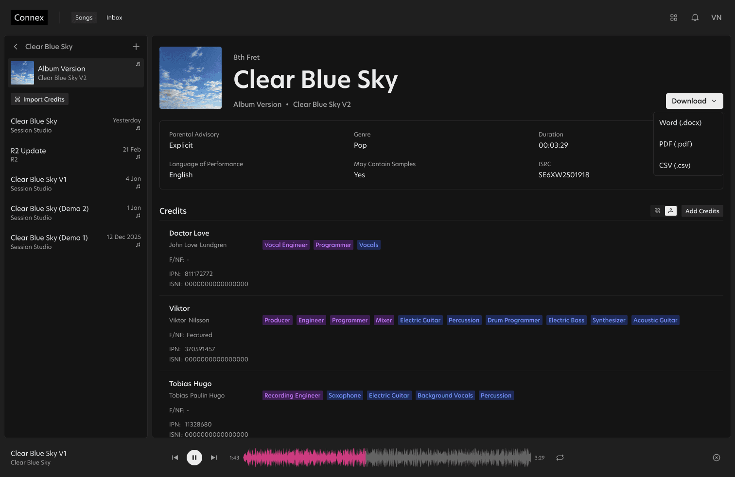 From solo operators to global rights organisations, Connex gives you one place to manage Audio + Metadata.